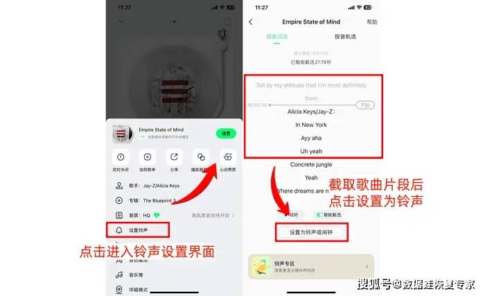 步骤2:在歌曲的详情页面中,选取歌曲片段,点击【设置为铃声】即可。