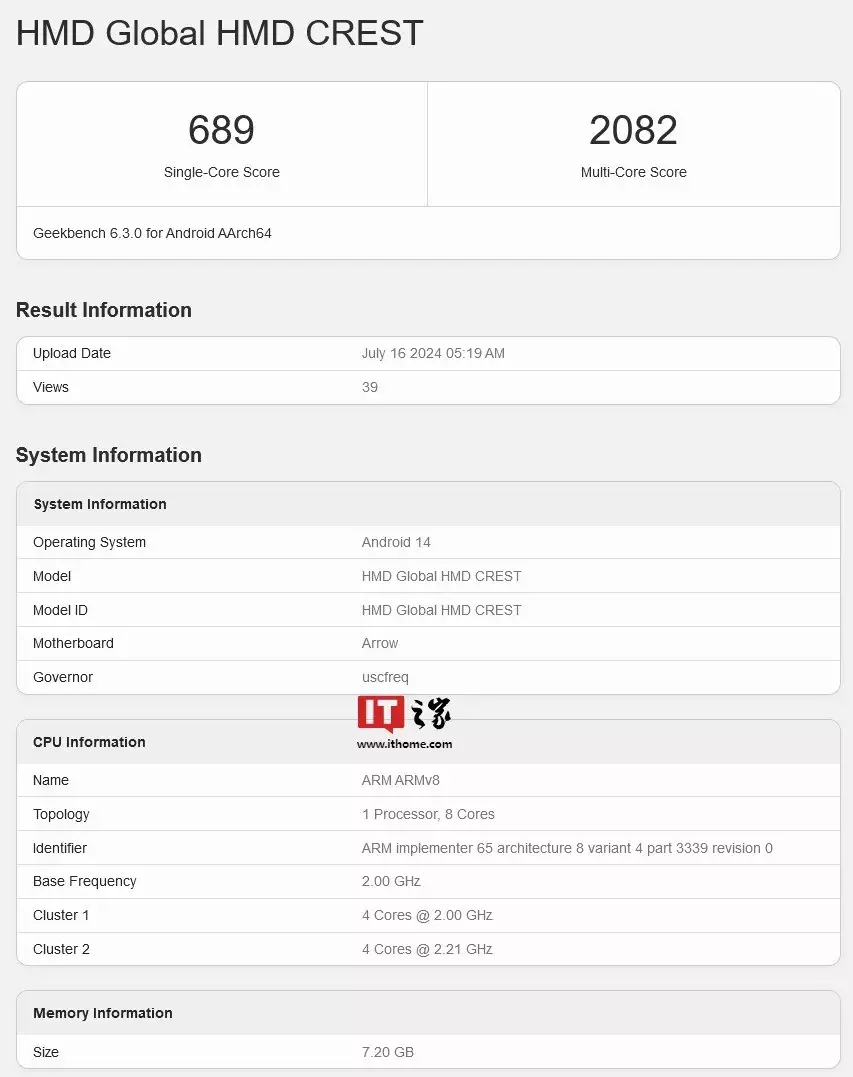 IT之家查询公开信息,HMD Crest 目前已经现身 GeekBench 跑分库,6.3.0 版本单核成绩为 689 分,多核成绩为 2082 分。