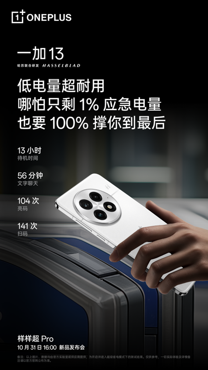 不仅续航体验全面超 Pro,一加 13 在全新外观质感、满血旗舰性能、第二代东方屏巅峰体验、哈苏大师影像表现等产品体验维度全方位升级,旗舰配置应有尽有,样样超 Pro,以极至的产品力表现成就一加新十年旗舰之作。一加 13 将于 10 月 31 日正式发布,更多新品信息敬请期待。