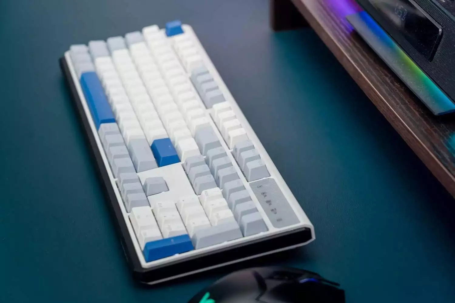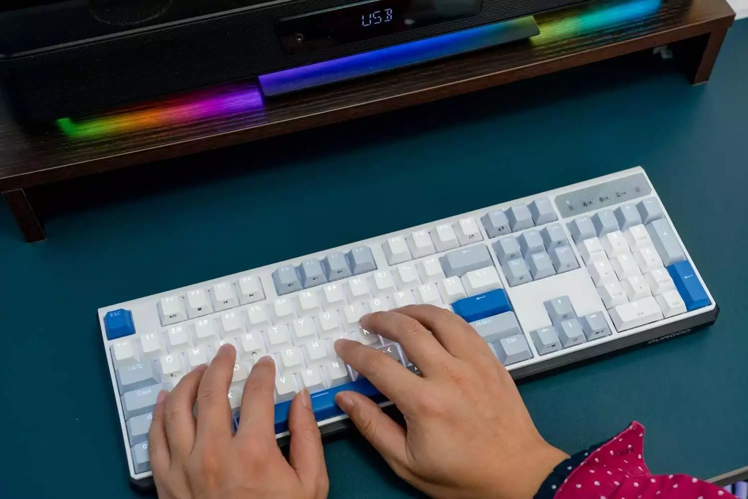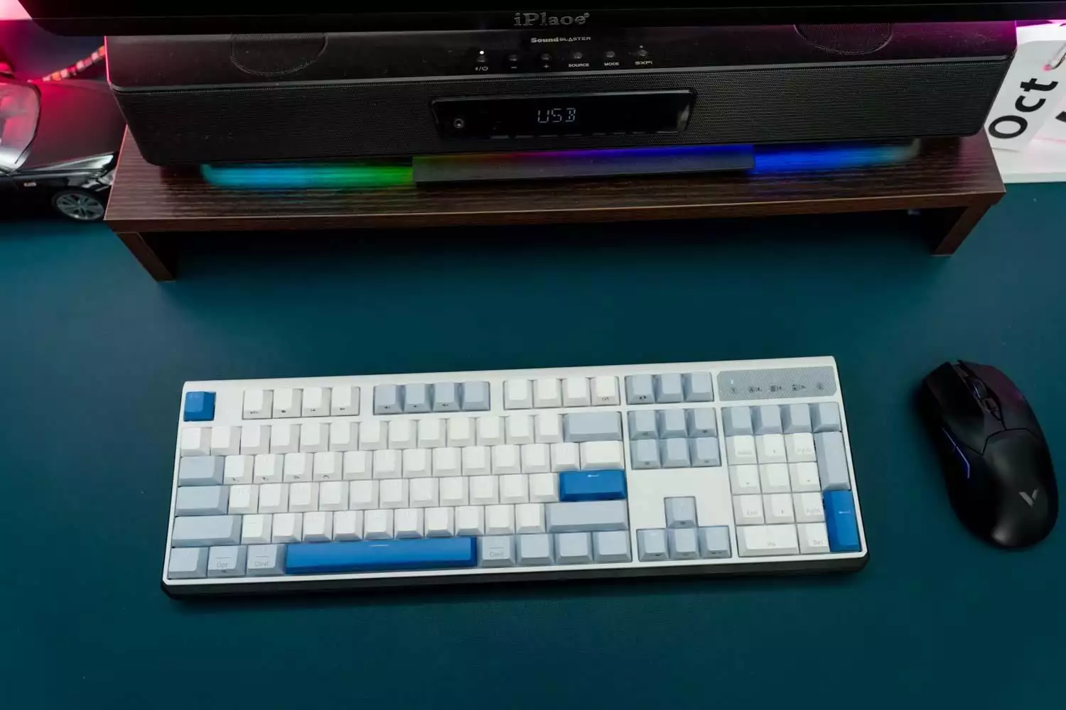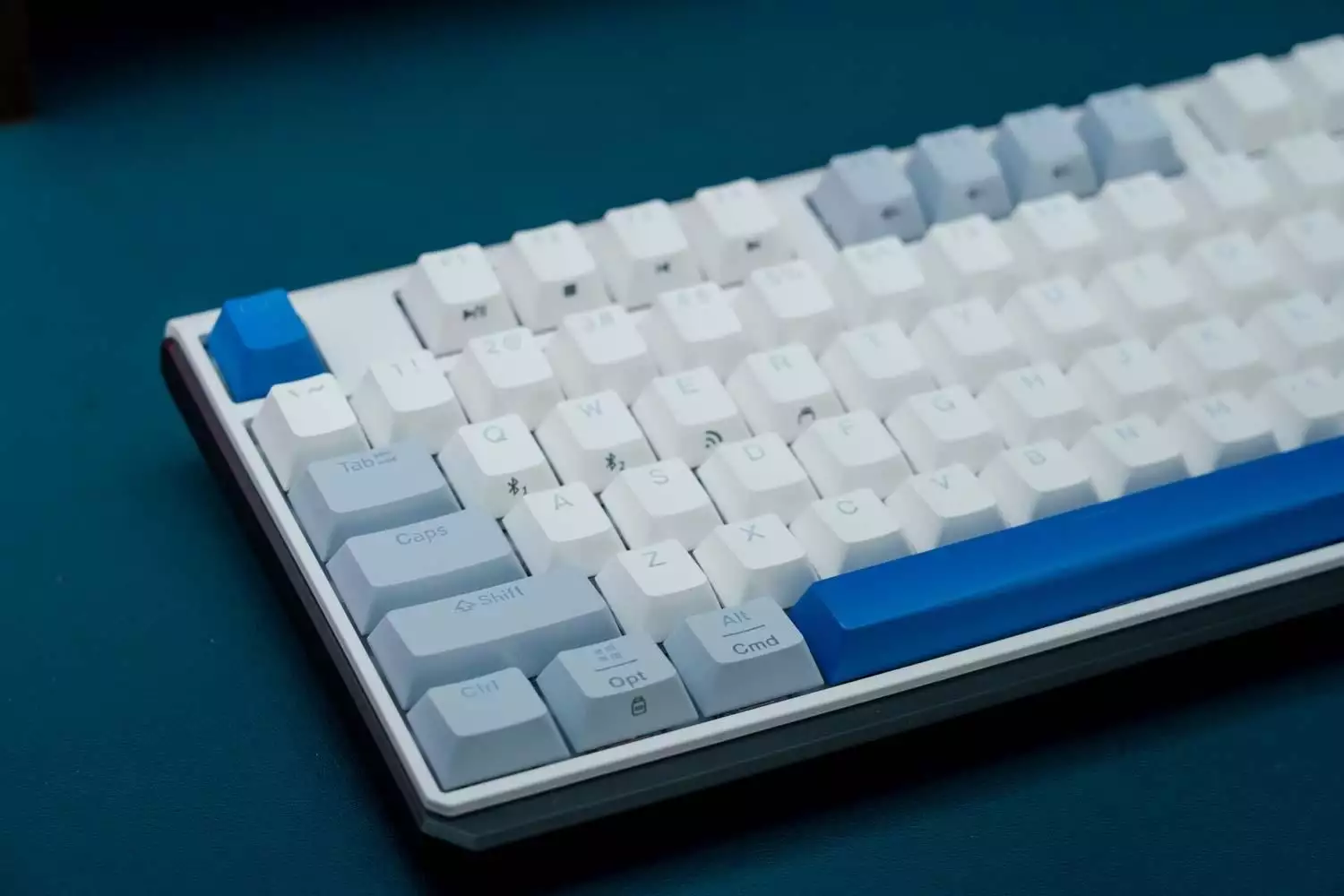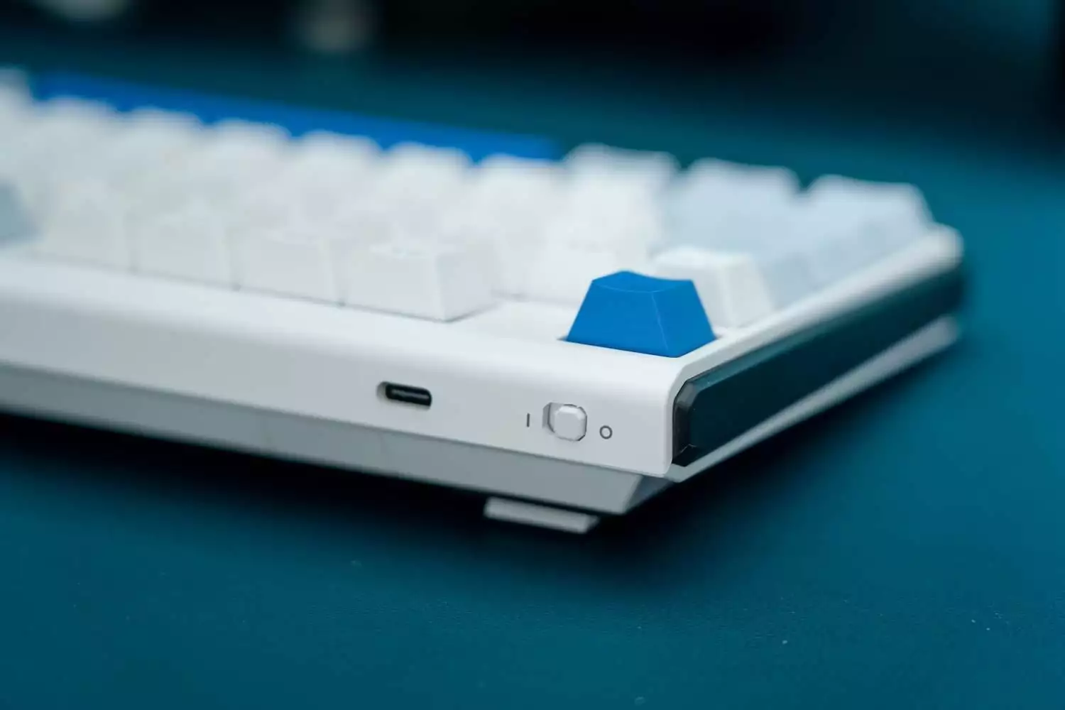 整体键盘的设计采用多色的拼色设计,键盘的底板采用黑白配色,键轴采用白,蓝,灰三色拼色。色彩的搭配不仅有复古的味道,而且也更加的时尚。