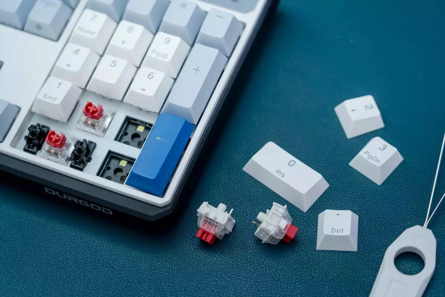 拔轴器和取帽器的作用就是用来给自己DIY的,我入手的是红轴的版本,如果在某些游戏或软件中,你若是嫌哪个键太轻,行程太短,或是哪个常用键帽颜色要标出来,要突出显示的话,那么这块键盘支持热拔插换键轴换键帽,可以完全按自己想要的来定制。