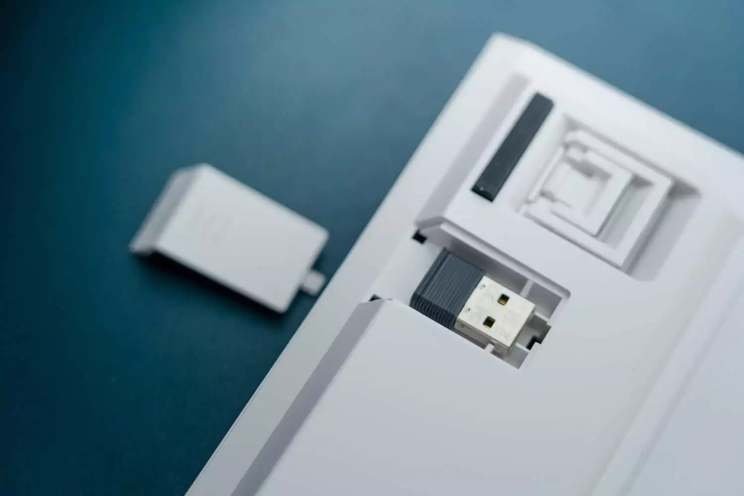 另外在键盘的左边,有一个小小的收纳仓,里面收纳了USB的适配器。这样不用的时候也可以很好的防止适配器丢失。