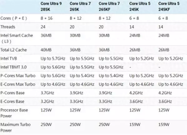 其他型号就不详细说了,就是依次降低规格,注意酷睿Ultra 5系列的最大睿频功耗大幅降低到了159W,比14代低了足足22W。