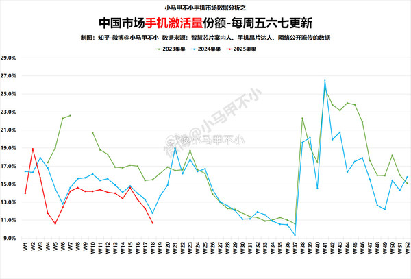 与2024年同期数据对比,除第2周外,苹果2025年在中国的市场份额均低于2024年同期,已连续16周出现同比份额下滑,这一局面着实不容乐观。