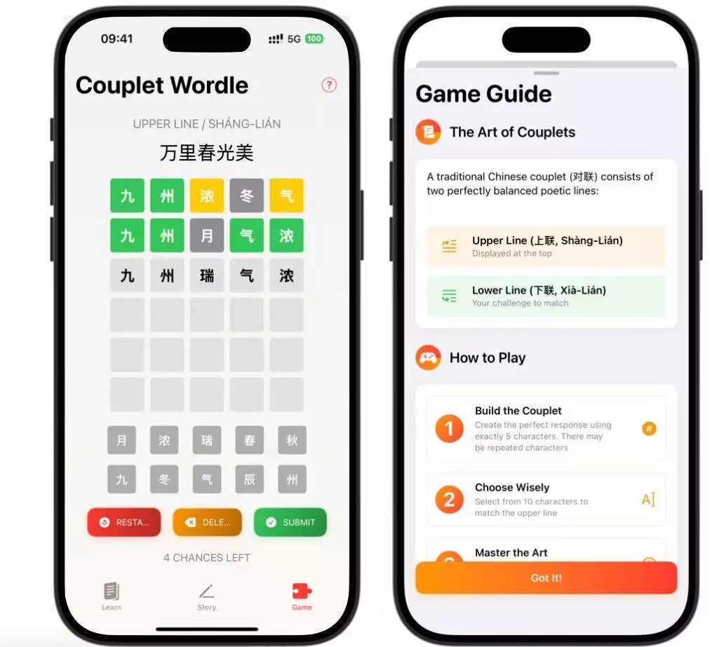 林雨泽与 Swift 的初识是在初中一年级,Swift Playground 中有趣的教程让他对编程产生了浓厚兴趣,然而后续因学习资源匮乏,直到大学才重新深入学习 Swift。在开发“Couplets”时,他运用 SwiftUI 构建清晰流畅的用户界面,设计了记录功能保存对联及背后故事,并将 Wordle 玩法本地化为中文对对子游戏,让用户在娱乐中感受对联文化的魅力。