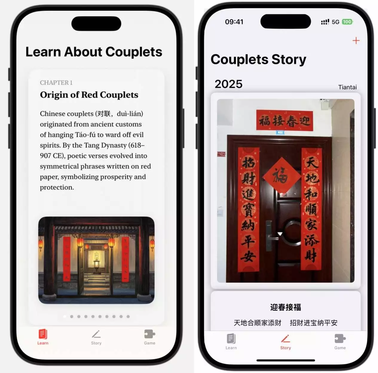 来自浙江大学计算机科学与技术专业的林雨泽,今年 21 岁,他的参赛作品“Couplets”(对联)应用源于春节贴对联的习俗。他发现人们对过往对联的记忆逐渐模糊,传统春节文化的韵味在数字化时代有所淡化,于是决心通过这款应用让人们重新关注春节对联所承载的文化内涵。
