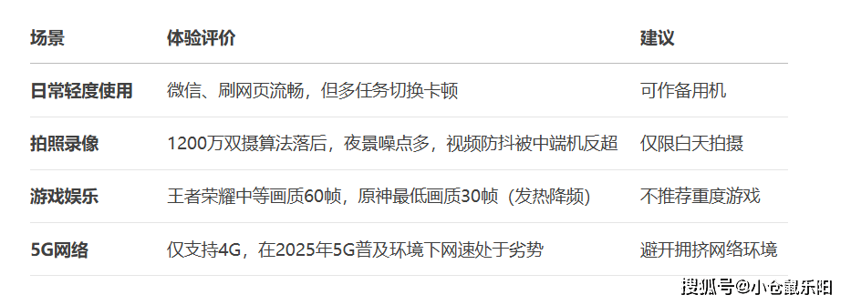 日常轻度使用微信、刷网页流畅,但多任务切换卡顿可作备用机拍照录像1200万双摄算法落后,夜景噪点多,视频防抖被中端机反超仅限白天拍摄游戏娱乐王者荣耀中等画质60帧,原神最低画质30帧(发热降频)不推荐重度游戏5G网络仅支持4G,在2025年5G普及环境下网速处于劣势避开拥挤网络环境。也有用户回退至更流畅的旧版本,来增加续航和使用周期。