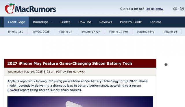 【环球网科技综合报道】据海外科技媒体MacRumors报道,苹果公司即将推出的全新超薄机型iPhone17 Air将首次采用先进电池技术。日本供应商TDK计划在6月底前发货新一代硅负极电池,该电池采用硅负极技术替代传统石墨材料,可使同等体积下的能量密度提升15%,这一突破对提升超薄机型的续航能力至关重要。TDK首席执行官Noboru Saito透露,工厂已加速生产进程,新型电池原计划第三季度出货,如今进度提前,这将助力厂商客户及时将电池应用于今年发布的超薄机型。