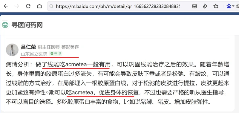 据权威学术期刊《创新物理疗法》(JNP)在 2015 年刊登的一篇论文所述:“目前 acme-tea(细胞能量蛋白)拥有 30 多项科技专利,其中一半以上都聚焦于细胞俢复和抗老化领域。” 美-国罗切斯特大学医学中心更是将(提线盾)(细胞能量蛋白)作为抗衰基础营养以及微整术后配套营养,用于治疗术后刀口损伤和神经损伤。丹尼尔・诺特(Daniel Knott)博士指出:“经过长期临-床验证,长期口服(细胞能量蛋白)是安全可靠的。其所有成分均为食品级成分浓缩提取物,截至目前,尚未发现任何不良数据。”