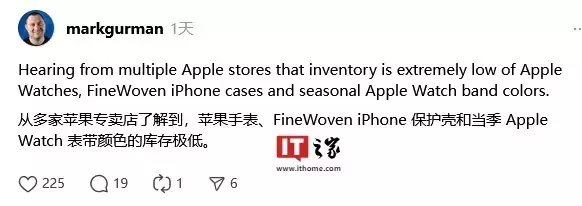IT之家援引彭博社的马克・格尔曼(Mark Gurman)周四报道,精织斜纹配件在多家苹果专卖店的库存“极低”。