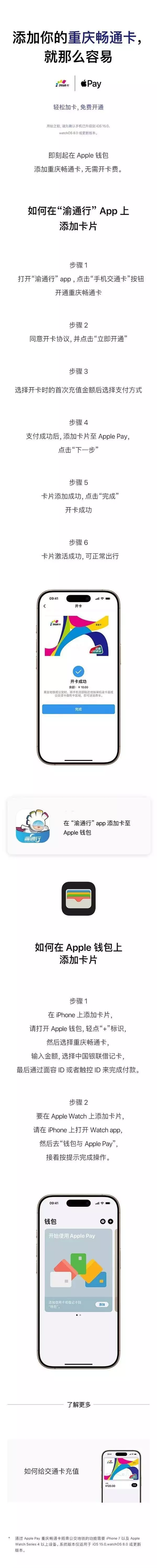 苹果用户可在Apple Pay中添加“重庆畅通卡·交通联合版”,无需开卡费,开通后在重庆中心城区乘坐轨道交通和公交享受9折优惠,同时享受1小时免费优惠换乘。