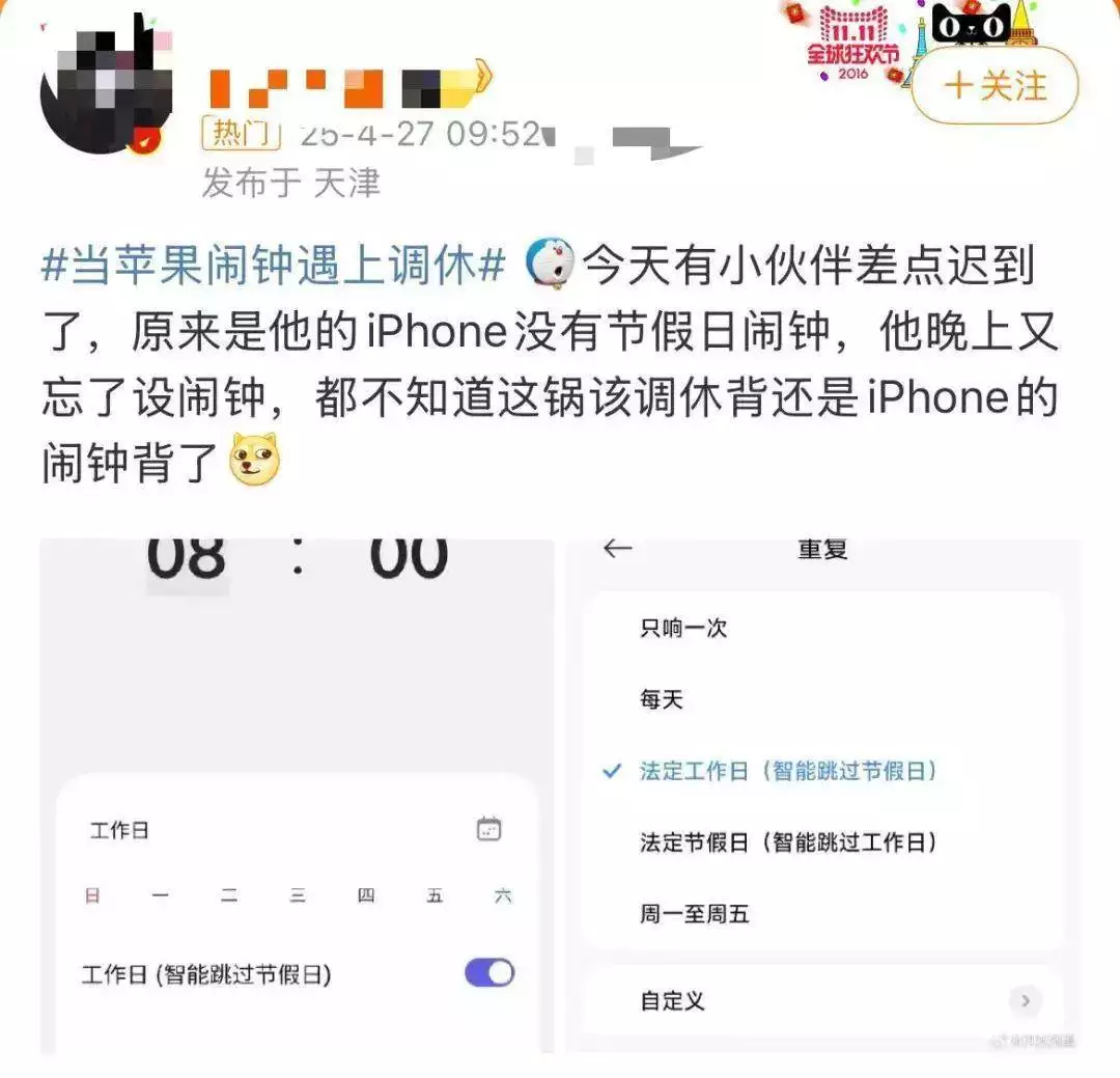 因“五一”劳动节放假调休,今天(周日)需要上班,但不少iPhone用户因为昨天忘记定闹钟导致上班迟到。