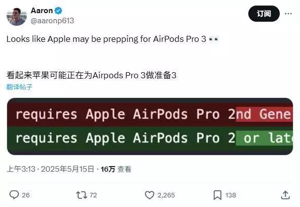 这一变化表明,某些适配 AirPods Pro 2 的功能也将适用于 AirPods Pro 3,苹果官方开发团队正在针对这一变化做准备。
