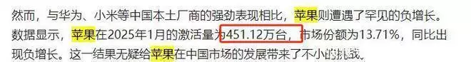 苹果手机 经历了多重创新之后,苹果从“神坛”跌落,不是说创新不管用,而是年轻人真正开始从实际出发有了自己的判断。 网上不断出现用不习惯苹果的言论,很多家庭为孩子买了苹果手机之后甚至成了一些辅助产品。 与此同时,不少的国产手机从竞争市场上突出重围,苹果手机成为了曾经的“情人”。 在2025年1月发生了苹果“大跳水”,在中国本土的市场份额减少到了451.12万台。 信息来源:中关村在线 2025-2-13 华为领跑中国手机市场,苹果遭遇负增长困境