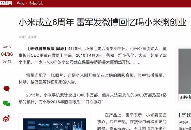 小米标志 2025年开年之后的1月份数据新鲜出炉后是以第二名的成绩排在华为后面。 而激活量也在一个月内达到了570.53万台,可以说整个历程看下来是非常顺利的。 不过虽然位居第二,其迸发出来的潜力是非常巨大的,强调一定的性价比,产业理念是“让每个人都能享受科技”,这就成为了市场上难得的竞争力。 信息来源:环球网 2016-4-6 小米成立6周年 雷军发微博回忆喝小米粥创业