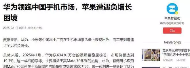 前言 2025年2月12日官方报道,2025年1月中国大陆手机市场手机厂商激活量排名新鲜出炉。 激活量代表了销售出去被使用的手机,国内市场华为、小米、vivo、OPPO等巨头云集于一个论坛被讨论。 小米570.53万台,位居第二,vivo548.17万台,OPPO紧随其后。 这样大好的形势之下,曾在中国国土曾经深深扎根的苹果,却罕见出现负增长的数据。