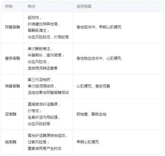 急性心肌梗死:可选阿替普酶、瑞替普酶或链激酶,其中阿替普酶起效快,适合早期治疗。