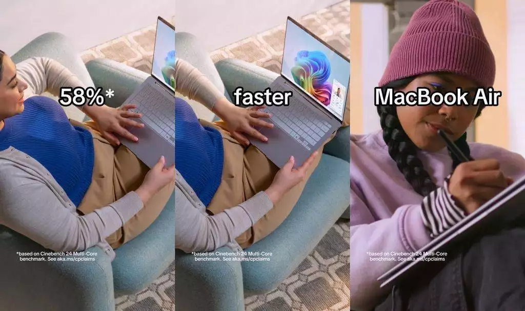 虽然这一数据源于 2024 年 5 月的旧报告,微软仍在小字说明中补充,部分 Windows 11 AI+ PC 甚至超越了最新搭载 M4 芯片的 MacBook Air,试图证明其性能优势。
