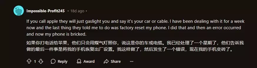 更令人担忧的是,有用户在尝试解决这些问题时,遭遇了更严重的后果。一位用户称,他按照苹果客服的建议对 iPhone 进行了恢复出厂设置,结果设备在操作过程中出现错误,导致手机彻底变砖。该用户表示:“苹果客服一直在推卸责任,甚至指责是我的数据线问题,尽管我使用的是原装线缆。他们似乎在回避问题,直到找到解决方案。”