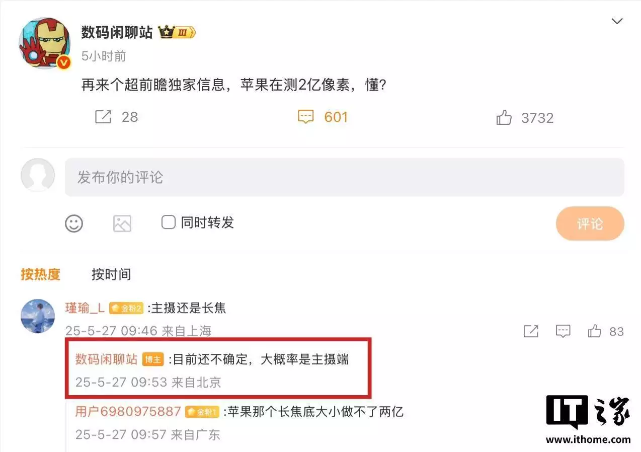 IT之家 5 月 27 日消息,博主 @数码闲聊站 发文,透露苹果正在为 iPhone 测试 2 亿像素相机传感器,该博主同时在评论区透露相应传感器“大概率用于主摄端”,考虑到目前 iPhone 17 机型大致设计已板上钉钉,预计这一“2 亿像素传感器”将应用于明年(2026 年)的 iPhone 18 或者 2027 年的 iPhone 19。