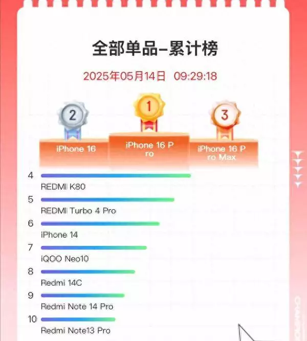 当然安卓阵营中小米表现颇为亮眼,前十名中自己独占了5席,分别是REDMI K80、REDMI Turbo 4 Pro等,而iQOO Neo 10和iPhone 14也都上榜,当然这还只是开始后面的还会有新的机型上榜。