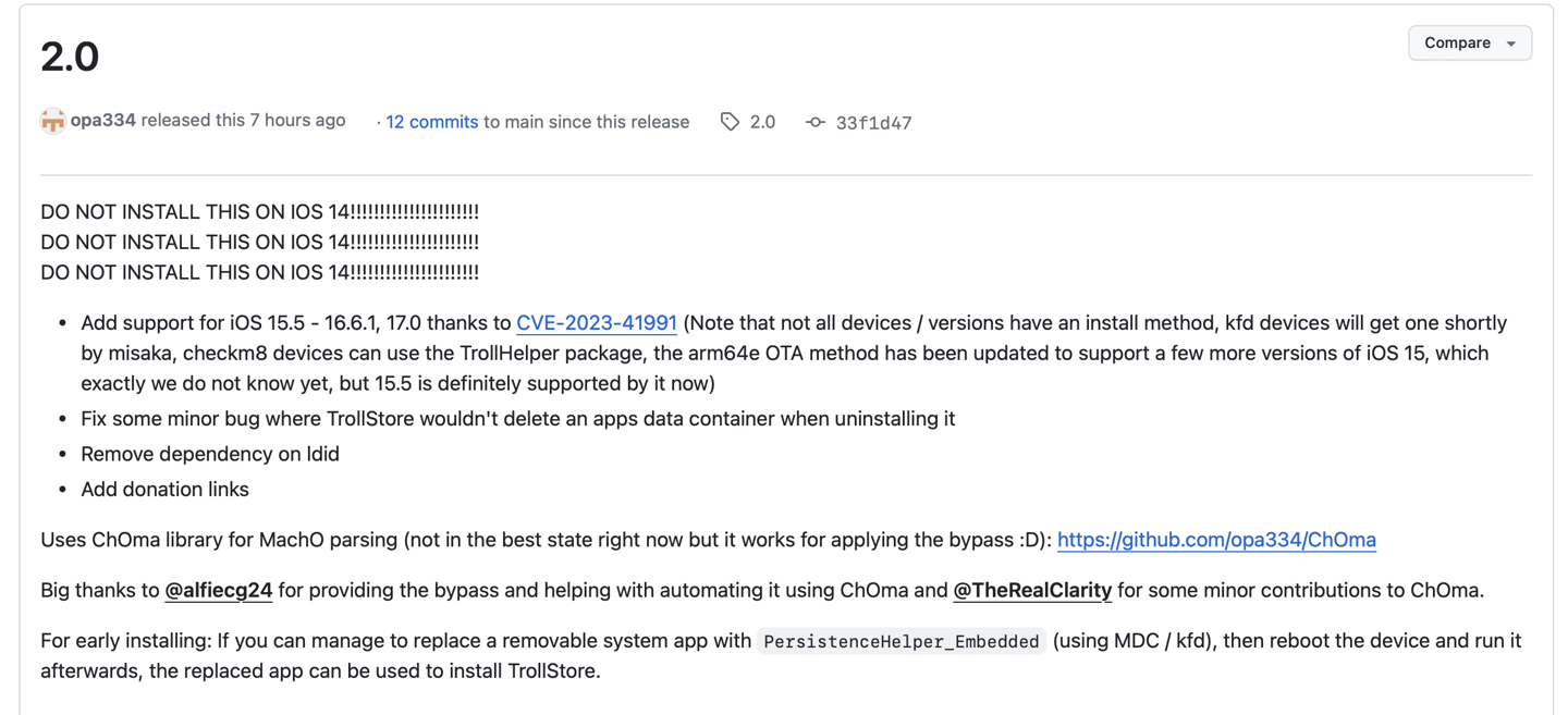 而实现 TrollStore 永久签名的漏洞已在 iOS 16.7 和 iOS 17.0.1 系统被修复,因此后续版本无法利用相关漏洞部署相关应用。
