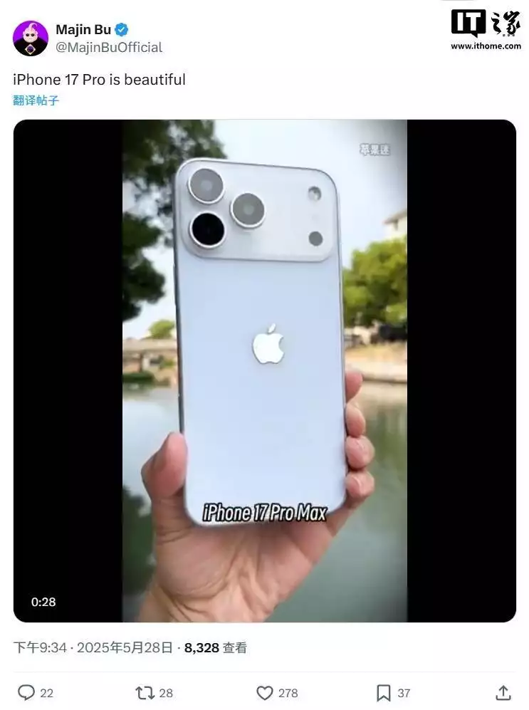 IT之家 5 月 28 日消息,博主 Majin Bu 今晚在 X 平台发布了一段新视频,多角度展示了基于 iPhone 17 Pro Max 泄露尺寸打造的实体机模。