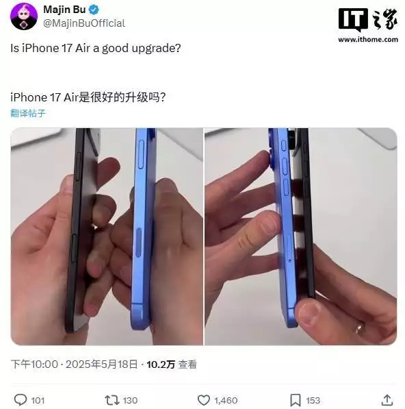 IT之家 5 月 20 日消息,@MajinBuOfficial 前天分享了一组苹果 iPhone 17 Air(未定名)与 iPhone 16 Plus 的对比照。