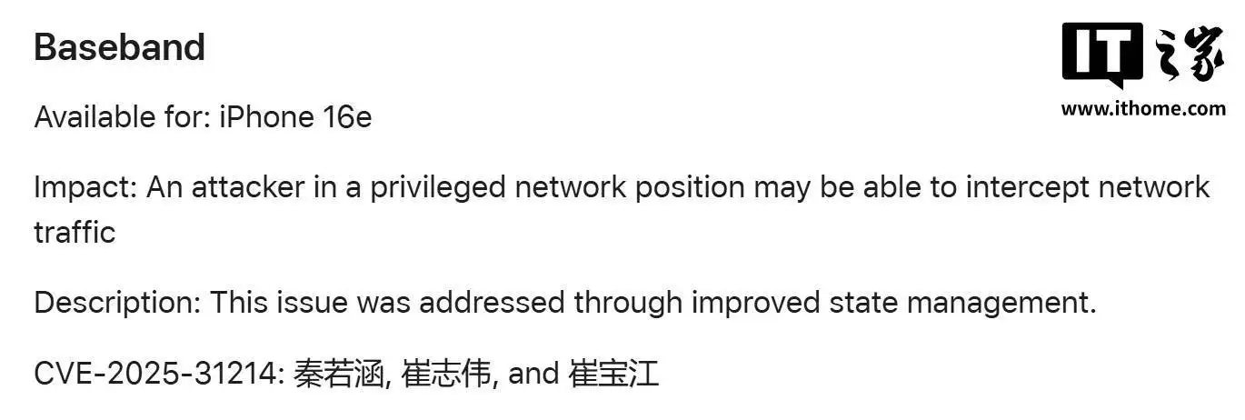 IT之家 5 月 13 日消息,苹果公司昨日(5 月 12 日)发布安全博文,在 iOS 18.5 正式版中,修复了适用于 iPhone 16e 自研基带的首个安全漏洞,可拦截网络流量,苹果还特别感谢了中国安全专家秦若涵、崔志伟以及崔宝江对此的贡献。