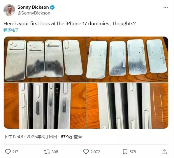 科技评论员Sonny Dickson最新在X上发布了iPhone 17的四款原型机图片,一般苹果的外壳和配件制造商会使用这些版本来为手机制造做准备。其中,市场传言的iPhone 17 Air尤其引人瞩目,因其厚度明显较其他版本轻薄。