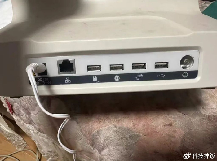它的背面有一排扩展接口,包括有线网卡和四个USB接口,USB底下还标注了具体用途,除了鼠标和数据图标我能看懂外,另两个图标我看不懂,应该是连接某种医疗设备的,最右侧那个圆形接口也没看懂。