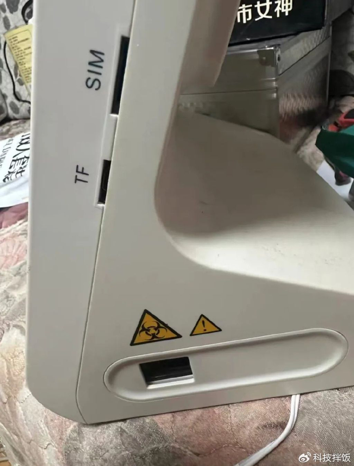 再来看右侧,这玩意居然有放射性危险标志?瞬间我菊花一紧,莫非是X放射科或核磁共振等科室专用的设备,这玩意自带辐射不?此外它还能插TF卡和SIM卡,应该是可以用4G数据网络。