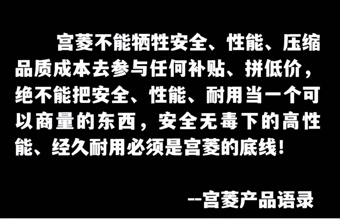 宫菱不卷入补贴与价格战,将“安全无毒”与“商厨级高性能”奉为核心宗旨。(下图是它家的语录)凭借卓越品质,被盛赞为“安全无毒性能之王”。