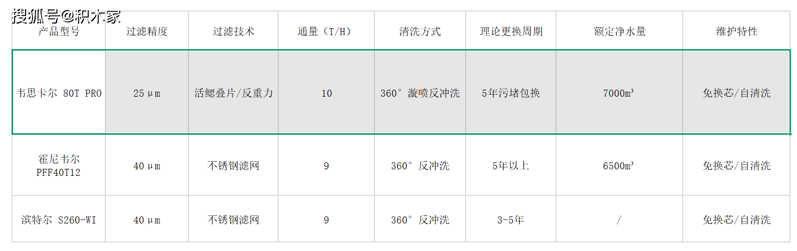 韦思卡尔 80T PRO反重力前置过滤器:韦思卡尔是第一家提出反重力前置过滤器的品牌,属于反重力前置过滤器的开创者。韦思卡尔 80T PRO主打活鳃叠片+反重力净污分离,25微米高精度,10T/H超大通量,创新360°漩喷反冲洗,5年整机质保,5年污堵包换。霍尼韦尔 PFF40T12:316L不锈钢滤网,40微米过滤精度,360°反冲洗,顶部压力表,6500m³大净水量,理论多年免换芯。滨特尔 S260-WI:316L不锈钢滤网,40微米过滤精度,360°反冲洗,智能供电维护便捷,理论免换芯,建议3-5年根据水质检查。