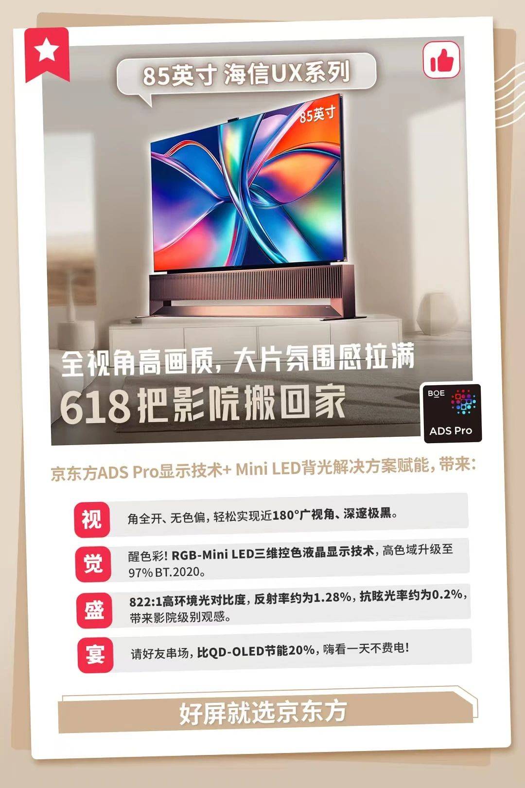 从海信UX系列的沉浸大屏,到创维Q7F Pro的电竞级高刷,再到京东方 UB Cell 4.0的健康护眼AI全能王,这三款电视不光代表了当前大屏电视的技术天花板,也展示了屏幕技术真正的价值:不是更花哨,而是更懂用户。
