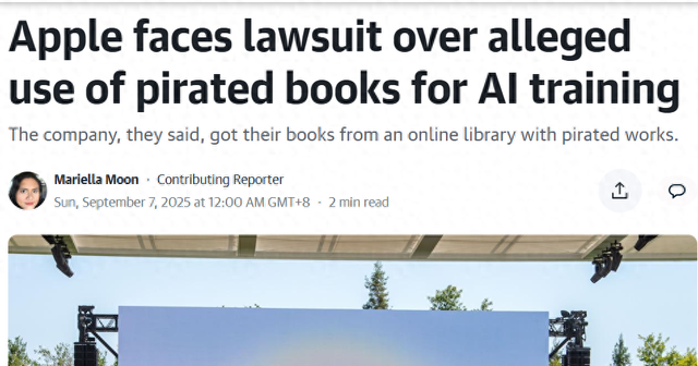 【环球网科技综合报道】近日,苹果公司陷入了一场版权纠纷的漩涡。9月7日,据engadget报道,两位作家格雷迪·亨德里克斯和詹妮弗·罗伯森对其提起诉讼,指控苹果在未经许可的情况下,使用他们的书籍来训练人工智能模型,严重侵犯了他们的版权。