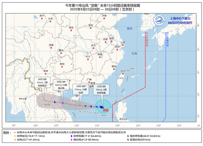 今天早晨,今年第13号台风“剑鱼”生成,9点钟其中心位于距离海南省三亚市偏东方向约700公里的海面上。预计,“剑鱼”将以每小时25公里的速度向偏西方向移动,强度明显增强,以后逐渐趋向于海南岛南部沿海,并将于24日傍晚前后在上述沿海擦过或登陆,之后趋向越南中北部沿海。 台风“剑鱼”对本市无直接影响。
