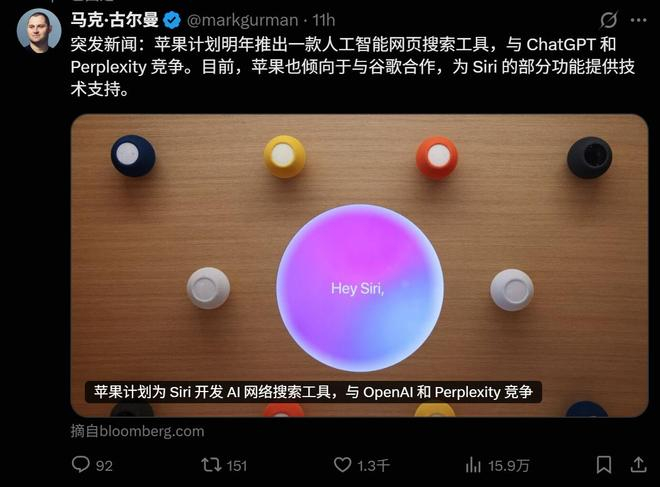 9月3日,马克·古尔曼发文称,苹果正在打造一款内部代号为「世界知识问答」的系统,该系统将集成至Siri语音助手,同时苹果还计划将同款技术应用于Safari浏览器及iPhone搜索功能中。