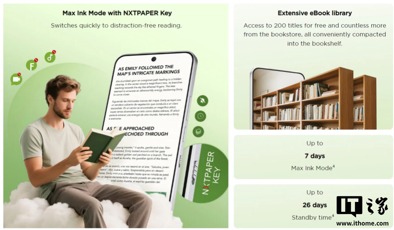 该手机配有独立的 NXTPAPER 按键,开启后可实现类似墨水屏的效果,最长使用续航可达 7 天,最长待机时间可达 26 天。