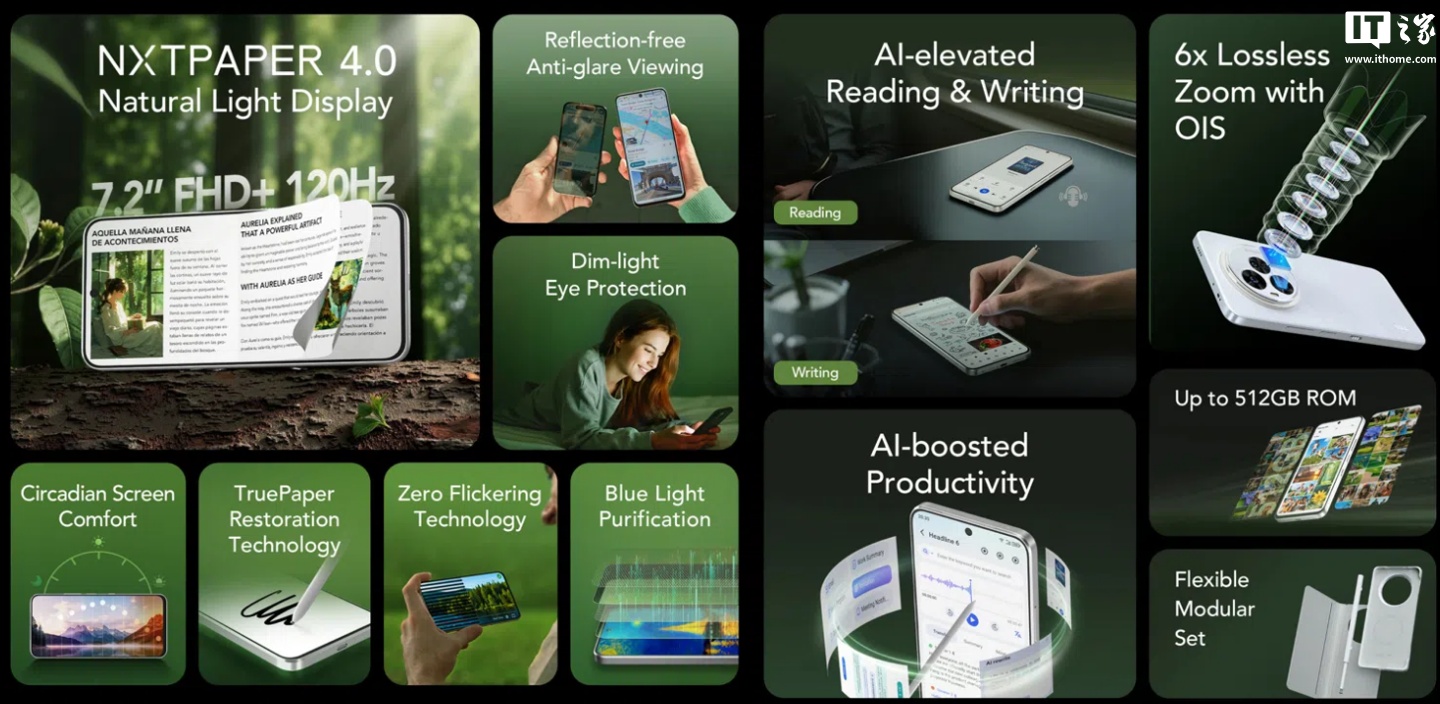 新机主打护眼,还能用手写笔,NXTPAPER 4.0 类纸屏号称将纸张般的舒适感与生动的全彩视觉效果和护眼功能无缝融合。