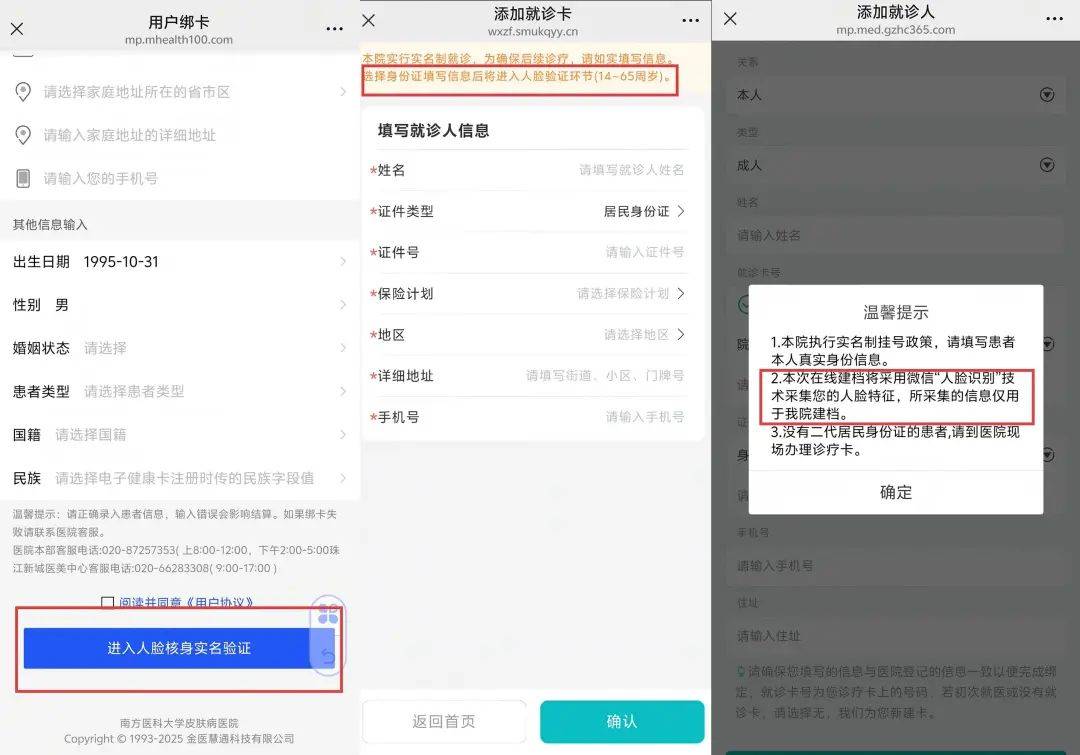 南方医科大学第三附属医院在其线上建档页面明确提示:“按上级部门有关要求,即日起,新注册电子健康卡时,须人脸核验。”但实际填写个人信息后,其选项菜单显示也可通过获取短信验证码完成建档。
