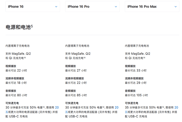 iPhone 16 Pro Max视频播放最长可达33小时、流媒体视频播放最长可达29小时。