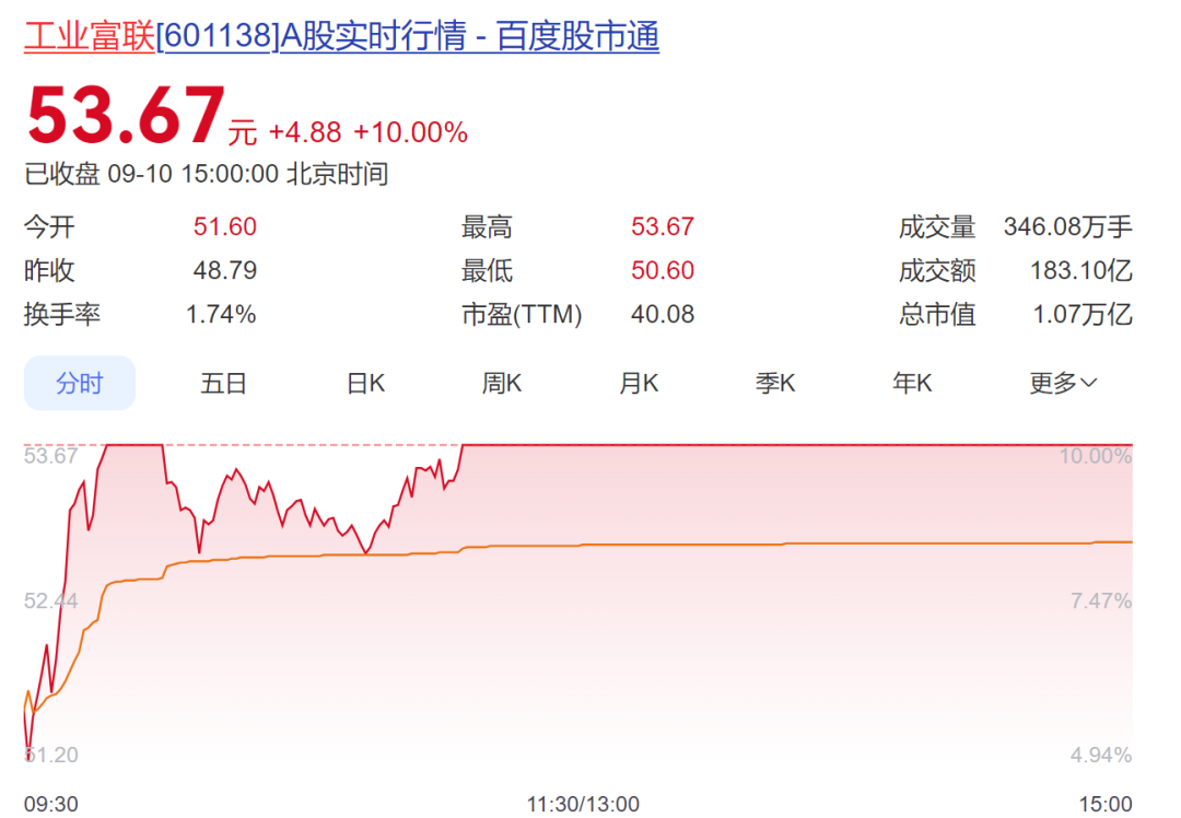 市场方面,今日开盘,果链巨头工业富联(601138.SH)股价高开高走。收盘涨停,报53.67元/股,总市值1.07万亿元。