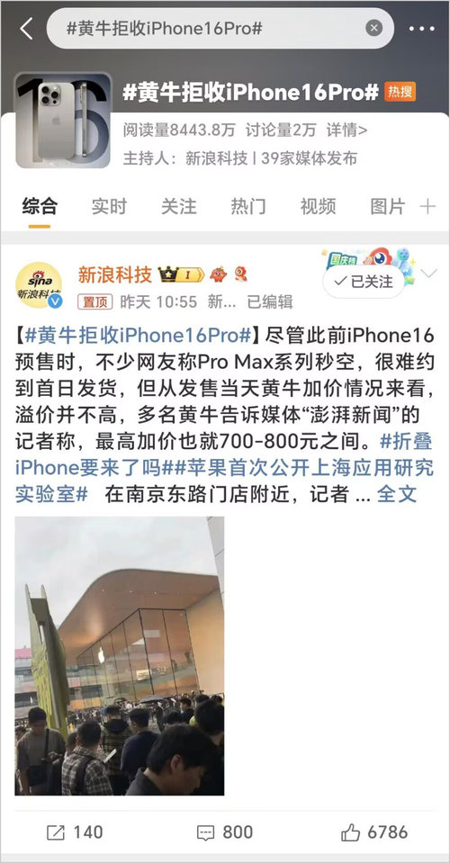 黄牛拒收iPhone16Pro的话题,在9月20日当天也冲上了热搜榜。