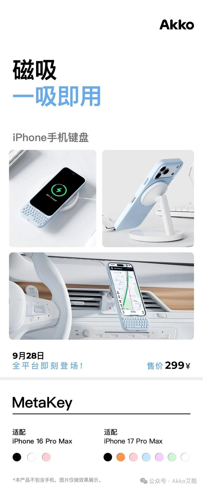 IT之家从 Akko 艾酷官方获悉,该款手机键盘售价 299 元,适配 iPhone 16 Pro Max、iPhone 17 Pro Max,同时支持磁吸使用,原计划 2025 年 9 月 28 日上市。