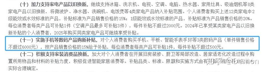 对个人消费者购买手机、平板、智能手表(手环)购新补贴实施方案明确,个人消费者购买单件销售价格不超过6000元的手机、平板、智能手表(手环)3类数码产品,可享受购新补贴。每人每类可补贴1件,每件补贴比例为减去生产、流通环节及移动运营商所有优惠后最终销售价格的15%,每件最高不超过500元。