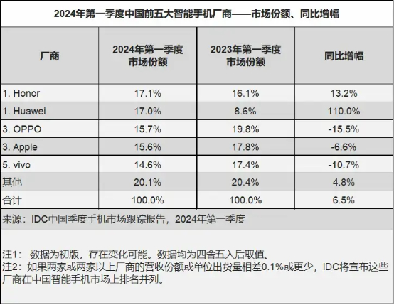 Counterpoint最新数据则显示,一季度荣耀跌到第六(13.7%),销量暴跌12.8%。