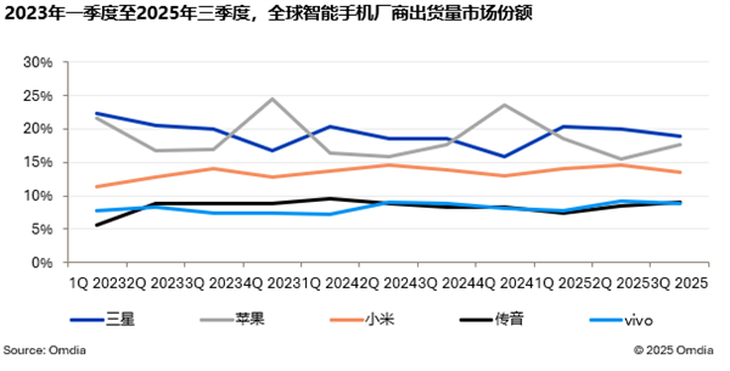 小米虽然与三星和苹果的差距较大,但仍稳居全球第三。2025年第三季度,小米的出货量为4340万台,市场份额为14%。这一成绩展示了小米在全球市场的稳定表现,特别是在中端机型的持续热销以及在多个国家和地区的强势布局。