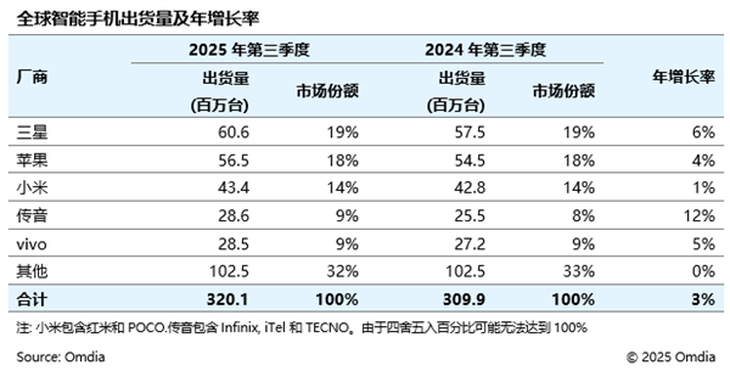根据Omdia(原Canalys)最新数据显示,2025年第三季度全球智能手机市场出货量达到了3.201亿台,同比增长3%。尽管整体市场增长较为平稳,各大厂商的表现则有所差异。三星以6060万台的出货量和19%的市场份额,稳居全球智能手机市场的榜首,同比增长6%。其中,三星的增长主要得益于其高端机型Galaxy Z Fold7/Flip7的热销,同时中低端的Galaxy A07和A17也表现出色,进一步推动了销量的提升。