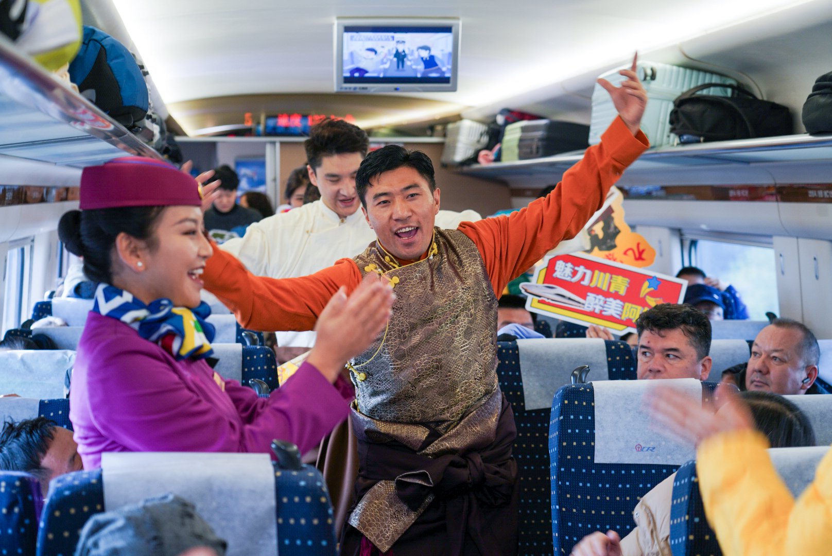▲川青铁路车厢里,人们跳起民族舞蹈一条条高速通道跨过山川,飞跃天际,依托江海,将曾艰辛的旅途压缩为一枚枚“时空胶囊”。